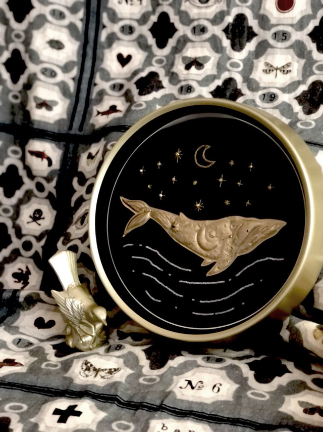 Grande Baleine, broderie de perles, cadre rond doré.
